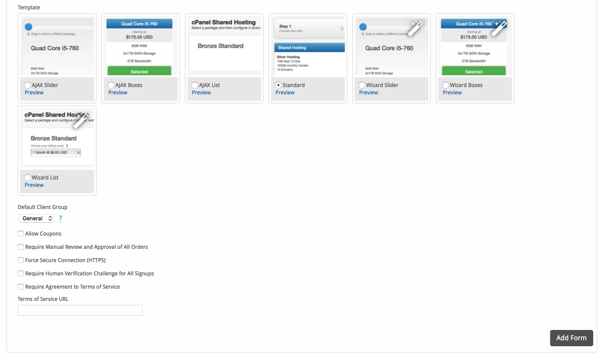 The first step is to create the order form where your customers can sign up. You can create a order form by going to [Packages] > [Order Forms] > [Add Order Form] .
