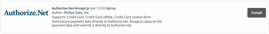 To install the Authorize.net payment gateway, visit [Settings] > [Company] > [Payment Gateways] > Available, and click the "Install" button for Authorize.net Accept.js.