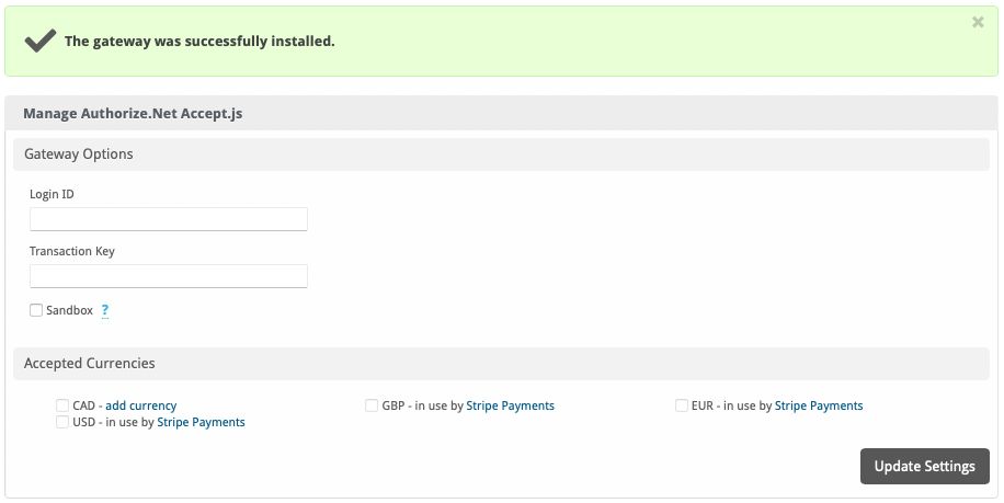 When finished, click "Update Settings" to save the details. You have successfully installed and configured Authorize.net!