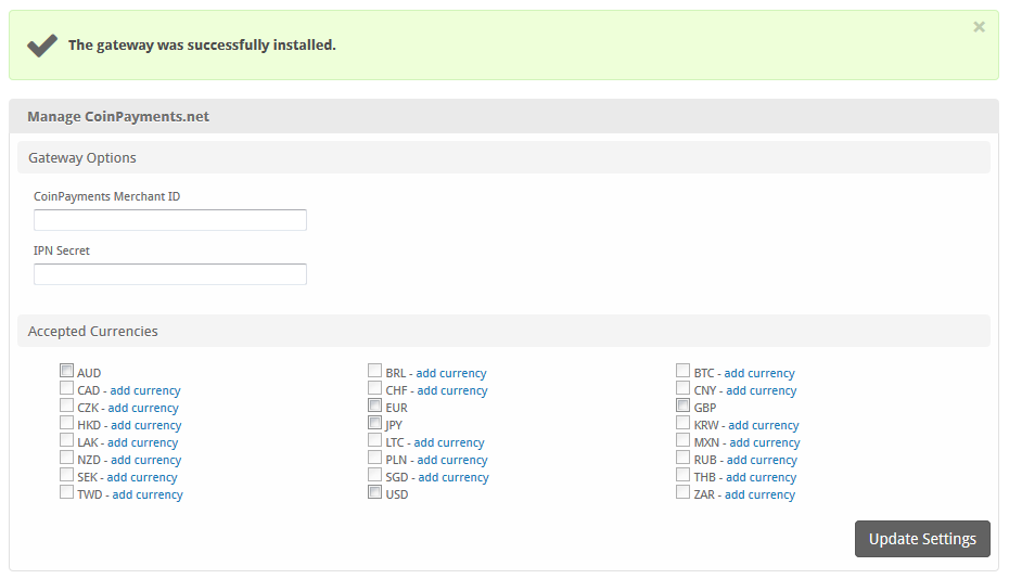 When finished, click "Update Settings" to save the details. You have successfully installed and configured CoinPayments!
