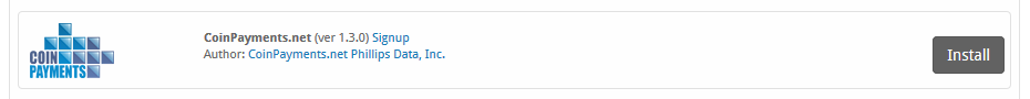 To install the CoinPayments payment gateway, visit [Settings] > [Company] > [Payment Gateways] > Available, and click the "Install" button for CoinPayments.