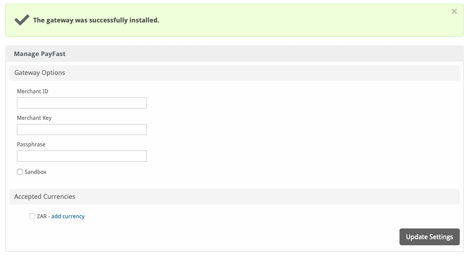 When finished, click "Update Settings" to save the details. You have successfully installed and configured Payfast!