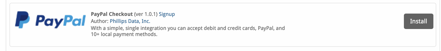 To install the PayPal Checkout payment gateway, visit [Settings] > [Company] > [Payment Gateways] > Available, and click the "Install" button for PayPal Checkout.