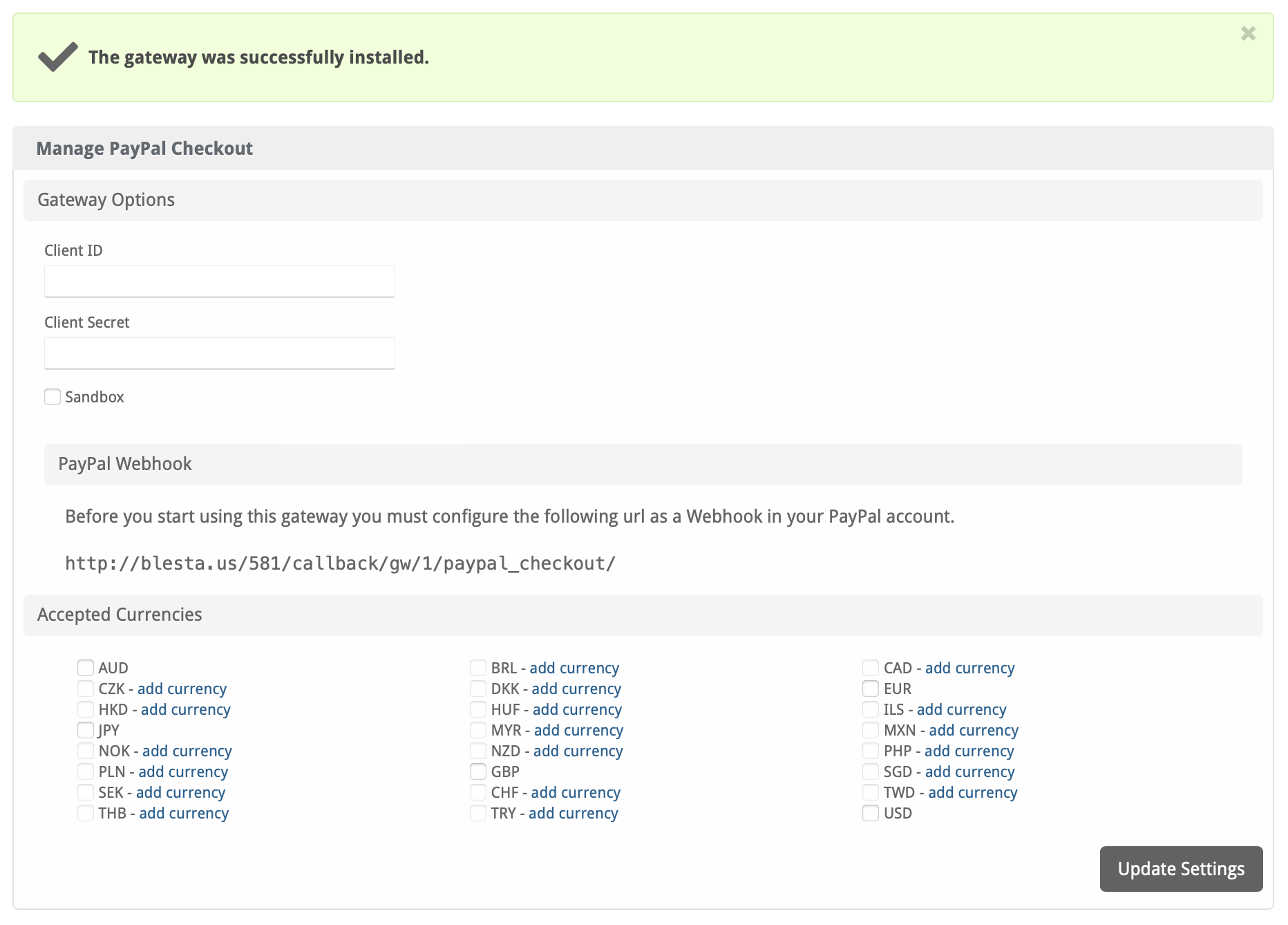| PayPal Webhook | Copy the webhook URL for use within your PayPal Checkout account. This is required for Blesta to be able to record payments made with PayPal Checkout. |