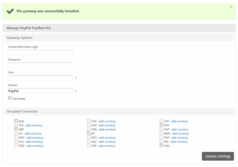 A message will be displayed, indicating that the payment gateway was successfully installed.