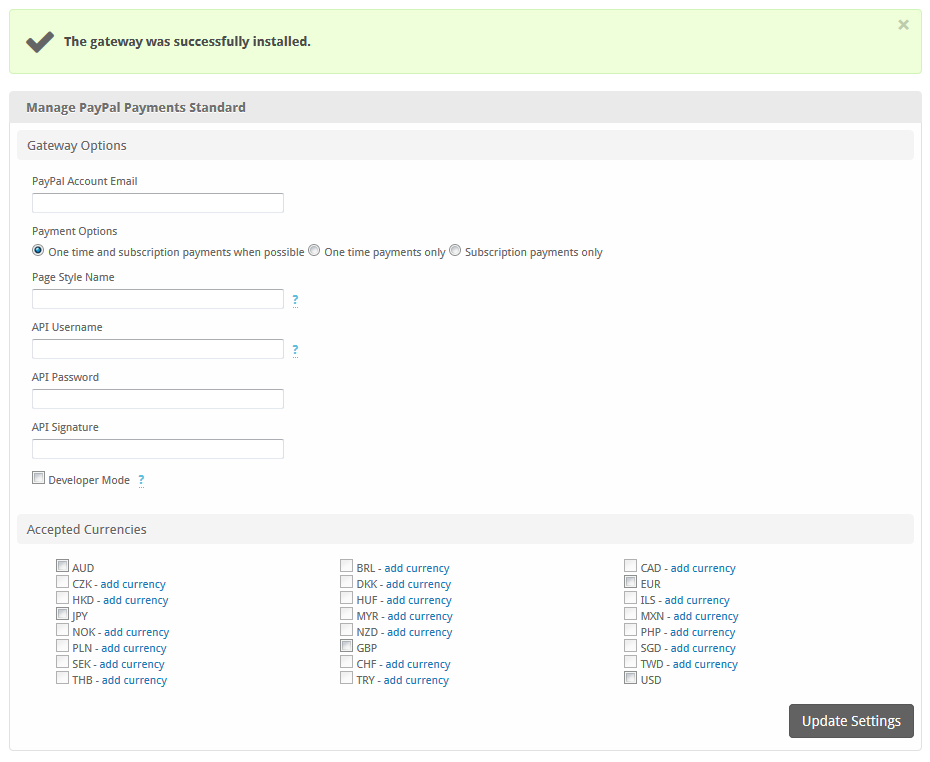 When finished, click "Update Settings" to save the details. You have successfully installed and configured PayPal Payments Standard!