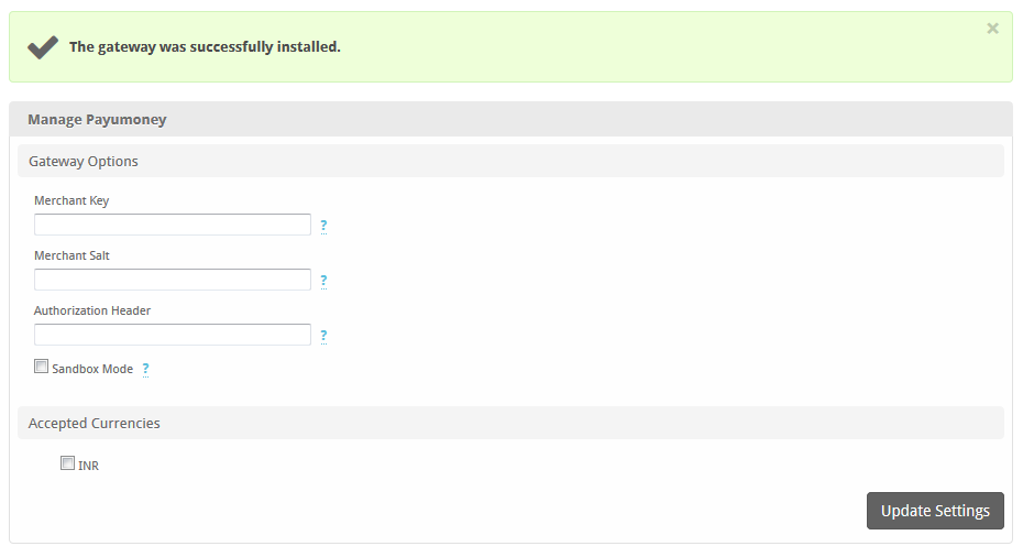 When finished, click "Update Settings" to save the details. You have successfully installed and configured PayUmoney!