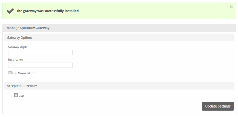 When finished, click "Update Settings" to save the details. You have successfully installed and configured Quantum Gateway!