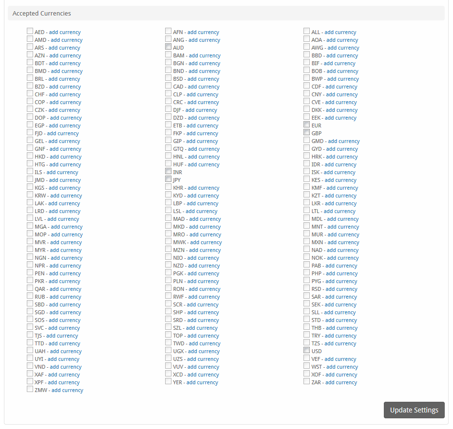 | Accepted Currencies | Check the currencies that you would like to be processed through this payment gateway.The following currencies are available:AED, AFN, ALL, AMD, ANG, AOA, ARS, AUD, AWG, AZN, BAM, BBD, BDT, BGN, BIF, BMD, BND, BOB, BRL, BSD, BWP, BZD, CAD, CDF, CHF, CLP, CNY, COP, CRC, CVE, CZK, DJF, DKK, DOP, DZD, EEK, EGP, ETB, EUR, FJD, FKP, GBP, GEL, GIP, GMD, GNF, GTQ, GYD, HKD, HNL, HRK, HTG, HUF, IDR, ILS, INR, ISK, JMD, JPY, KES, KGS, KHR, KMF, KRW, KYD, KZT, LAK, LBP, LKR, LRD, LSL, LTL, LVL, MAD, MDL, MGA, MKD, MNT, MOP, MRO, MUR, MVR, MWK, MXN, MYR, MZN, NAD, NGN, NIO, NOK, NPR, NZD, PAB, PEN, PGK, PHP, PKR, PLN, PYG, QAR, RON, RSD, RUB, RWF, SAR, SBD, SCR, SEK, SGD, SHP, SLL, SOS, SRD, STD, SVC, SZL, THB, TJS, TOP, TRY, TTD, TWD, TZS, UAH, UGX, USD, UYI, UZS, VEF, VND, VUV, WST, XAF, XCD, XOF, XPF, YER, ZAR, ZMW |