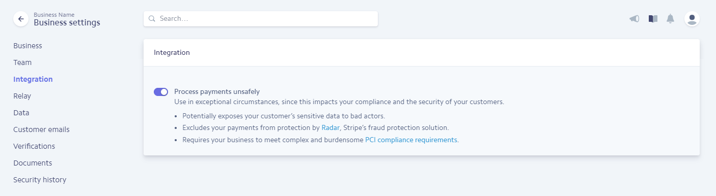 Sending credit card numbers directly to the Stripe API is generally unsafe. To continue processing use Stripe.js, the Stripe mobile bindings, or Stripe Elements. For more information, see https://dashboard.stripe.com/account/integration/settings.