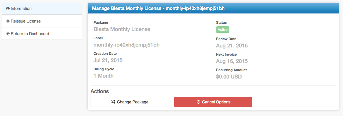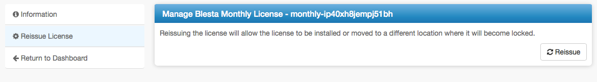 - Re-issue license (Allows the Blesta installation to be re-installed or moved to a new location)