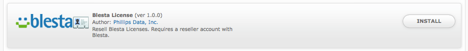 To install the Blesta License module, visit [Settings] > [Company] > [Modules] > Available, and click the "Install" button for Blesta License.