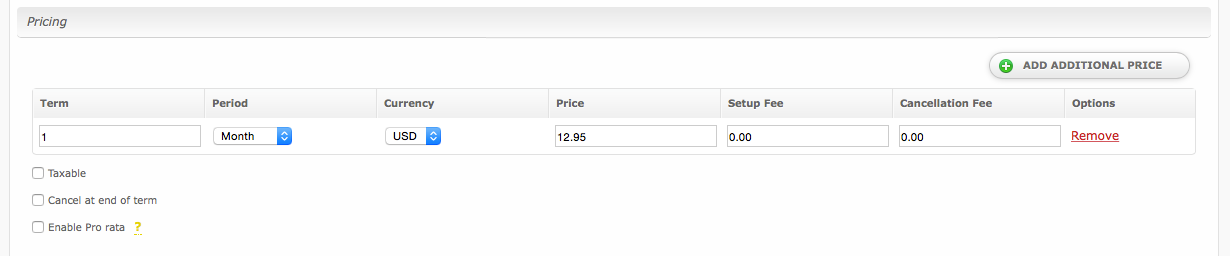 | Term | Enter the term for the desired pricing option. For example, if you wish to create a 3 month pricing option, enter 3 here. |