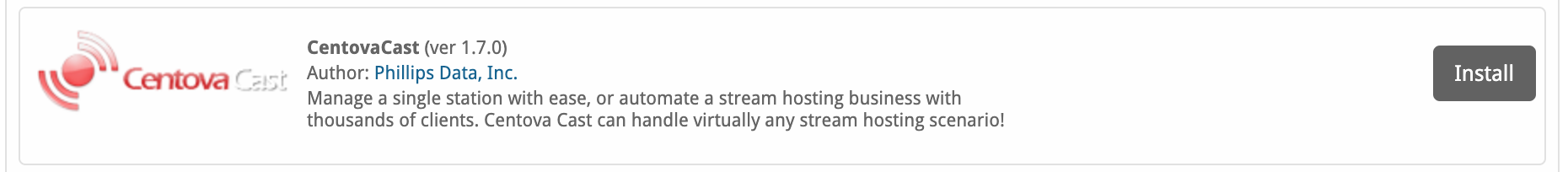 To install the CentovaCast module, visit [Settings] > [Company] > [Modules] > Available, and click the "Install" button for CentovaCast.
