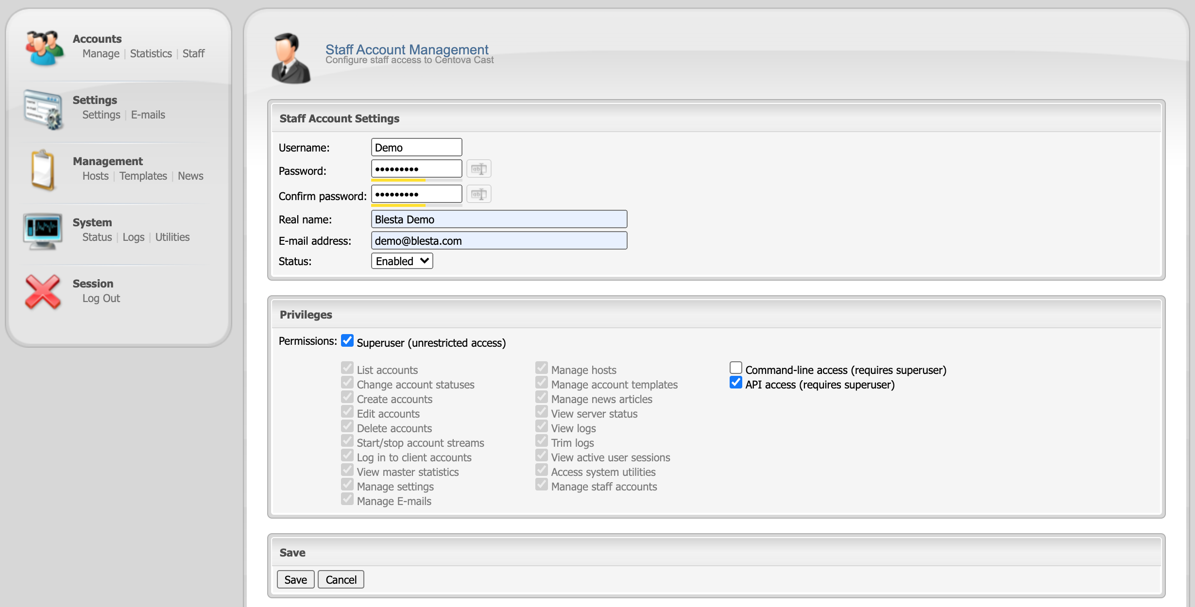 The username and password are the main parts we need to connect CentovaCast to the module, so keep them safe. We recommend using a different account to your main one incase you need to change the password at any time. For the "Privileges" we recommend making this account a superuser to create and manage accounts and the API Access is required for module to call CentovaCast.