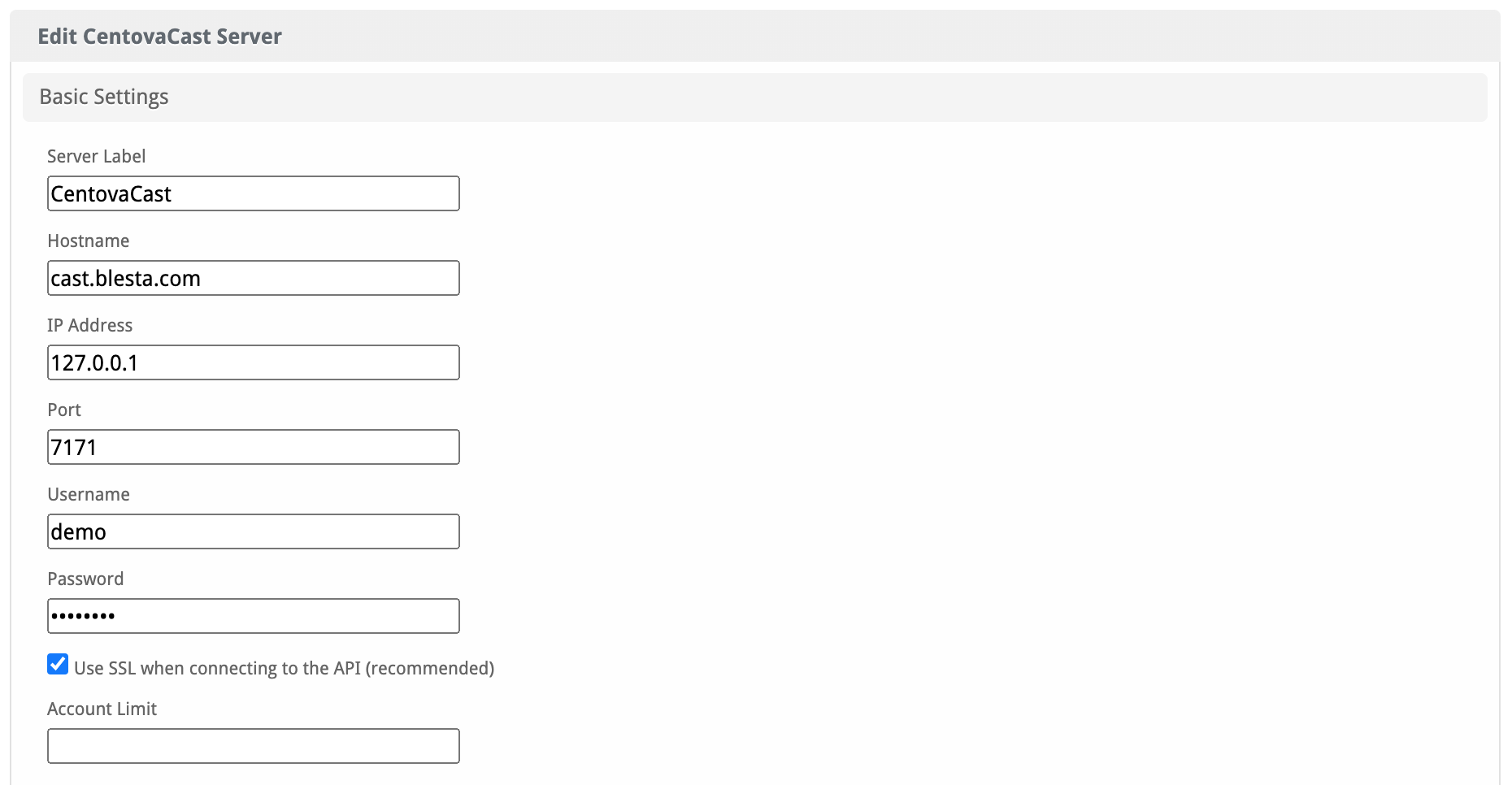 | Server Label | Enter a label for this CentovaCast server, it can be anything you like. |