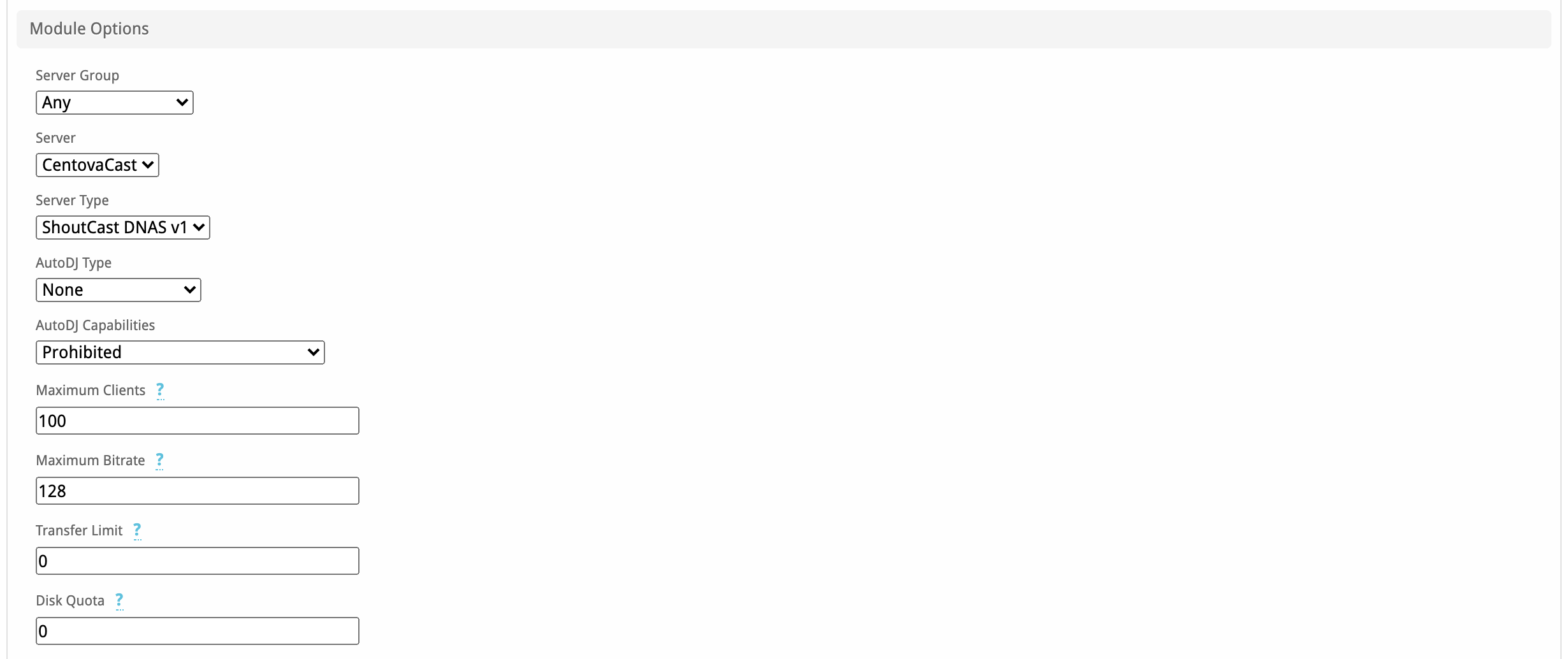 The Module Options section consists of the following options, which are specific to CentovaCast: