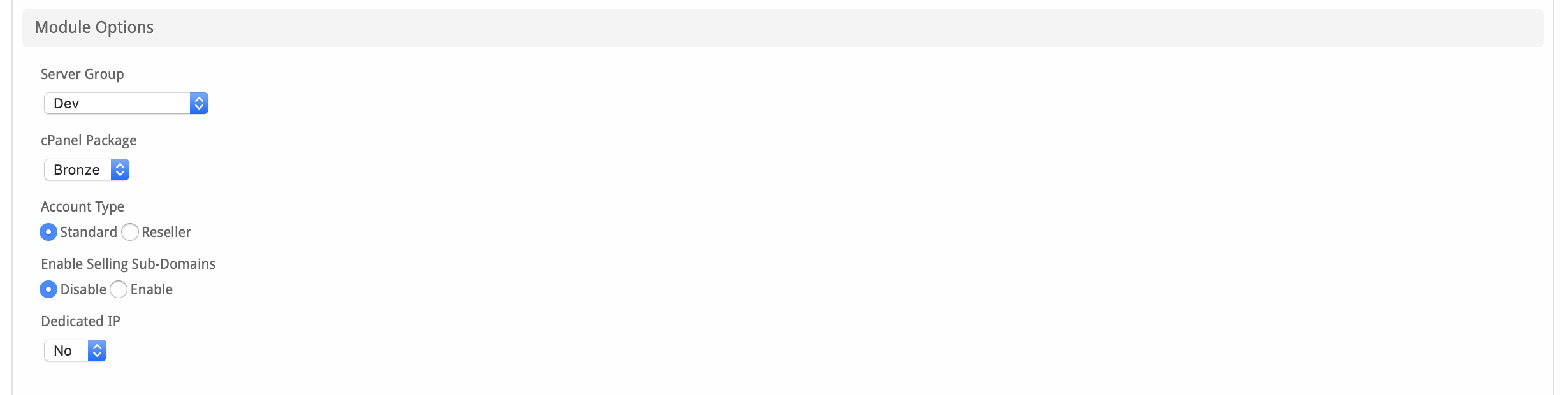 The Module Options section consists of the following options, which are specific to cPanel: