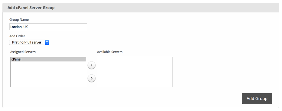 Server groups are useful for categorizing cPanel servers. When creating a Package, a specific server, or a server group may be selected for provisioning. Blesta will automatically select a cPanel server to provision with when a server group is chosen.
