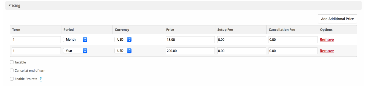 Click the "Add Additional Price" to add more pricing options. It's common for people to create 1 Month, 3 Month, 6 Month, and 1 Year price options. There are many possible combinations.
