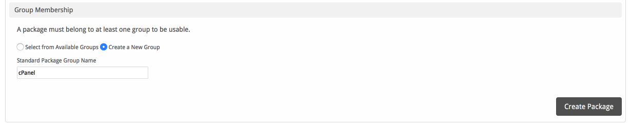 If this is the first Package you are creating with this module, select the "Create a New Group" option, and enter a Group name. If you are adding a subsequent Package and wish for it to be part of the same group, select "Select from Available Groups", and move the group from the right to the left of the multi-select box.