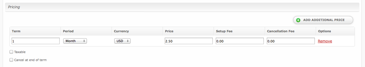 | Term | Enter the term for the desired pricing option. For example, if you wish to create a 3 month pricing option, enter 3 here. |