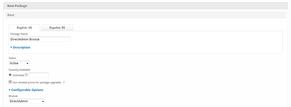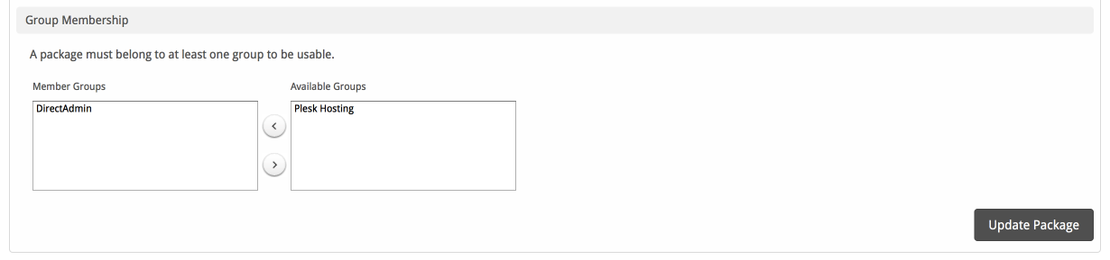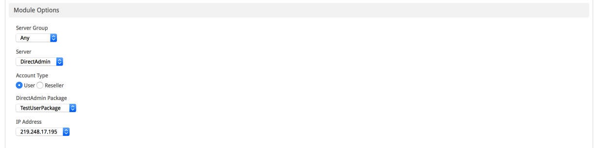 | DirectAdmin Package | Select the DirectAdmin Package to use when configuring accounts. These values are pulled from "Plans" created in DirectAdmin and specify resources for the plan. |