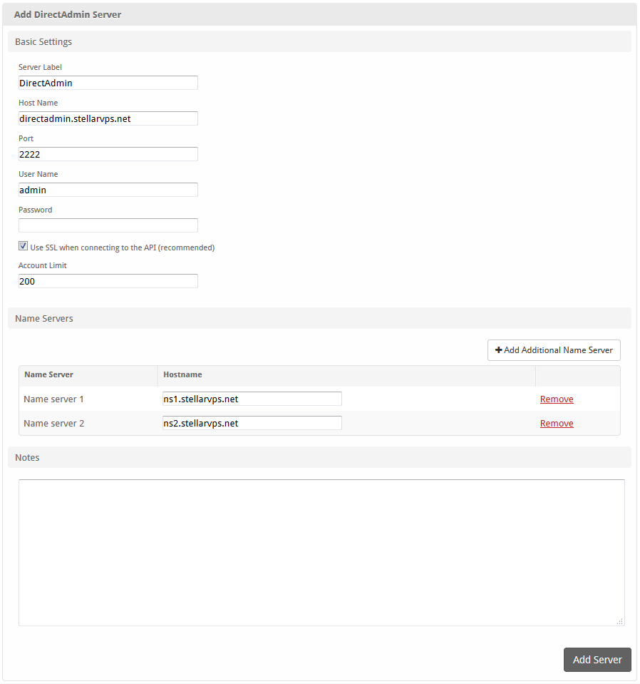 After filling out these options, click "Add Server" to add your DirectAdmin server.