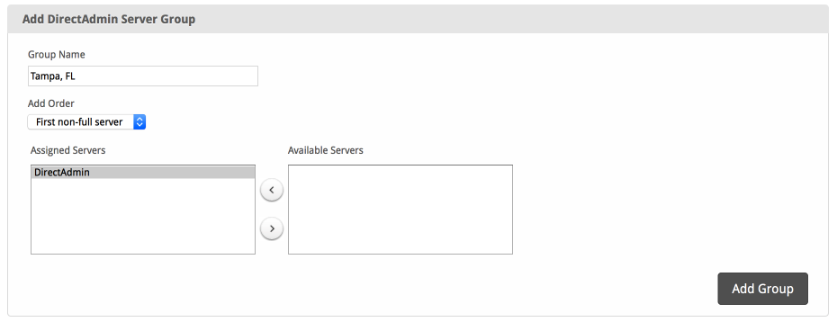 Server groups are useful for categorizing DirectAdmin servers. When creating a Package, a specific server, or a server group may be selected for provisioning. Blesta will automatically select a DirectAdmin server to provision with when a server group is chosen.