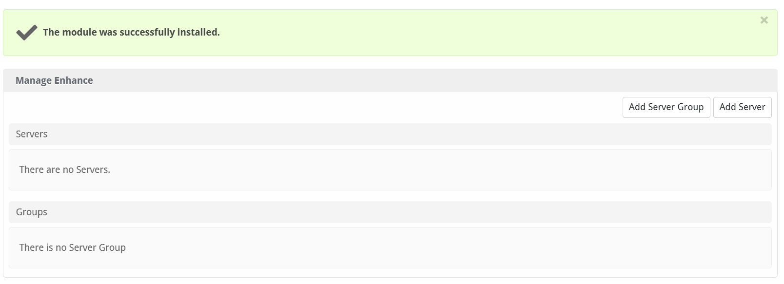 To add a server group, from the Enhance overview at [Settings] > [Company] > [Modules] > Enhance, click "Add Server Group", then enter the details.