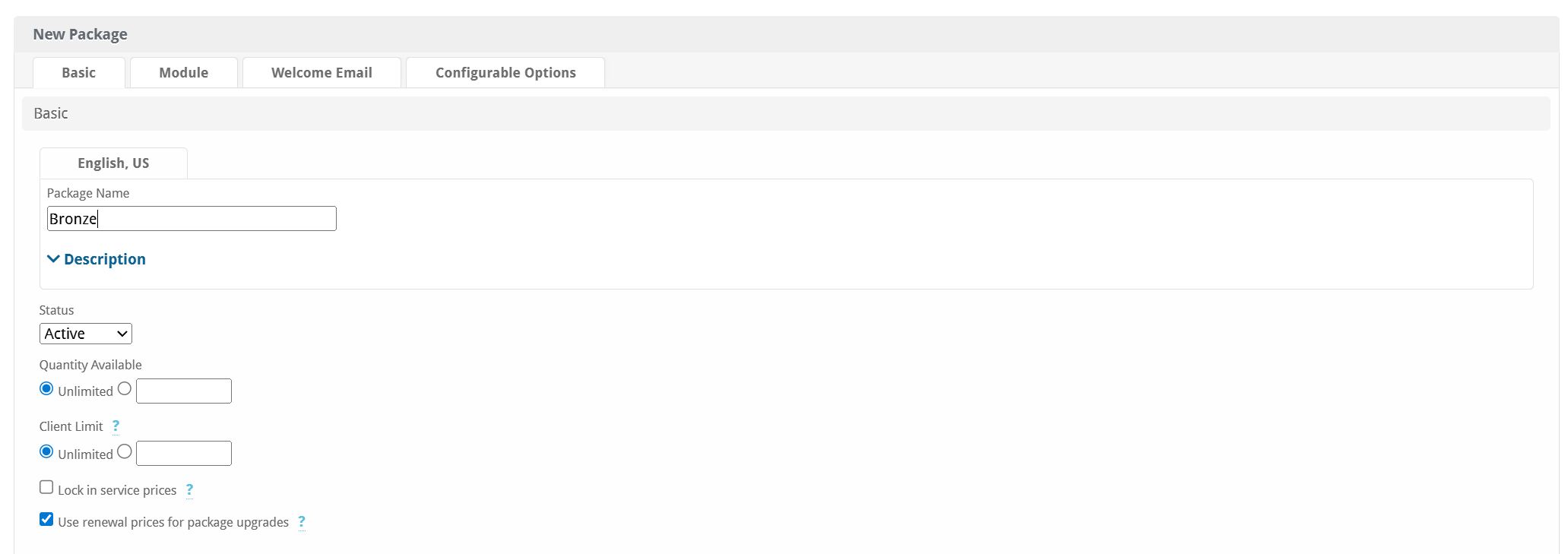 | Description | Enter a Description for this Package. HTML is allowed, and descriptions appear on order forms. |