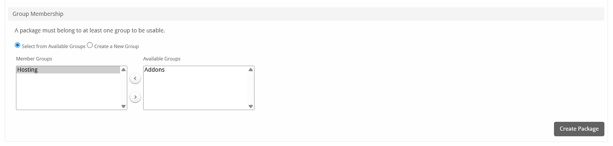 If this is the first Package you are creating with this module, select the "Create a New Group" option, and enter a Group name. If you are adding a subsequent Package and wish for it to be part of the same group, select "Select from Available Groups", and move the group from the right to the left of the multi-select box.