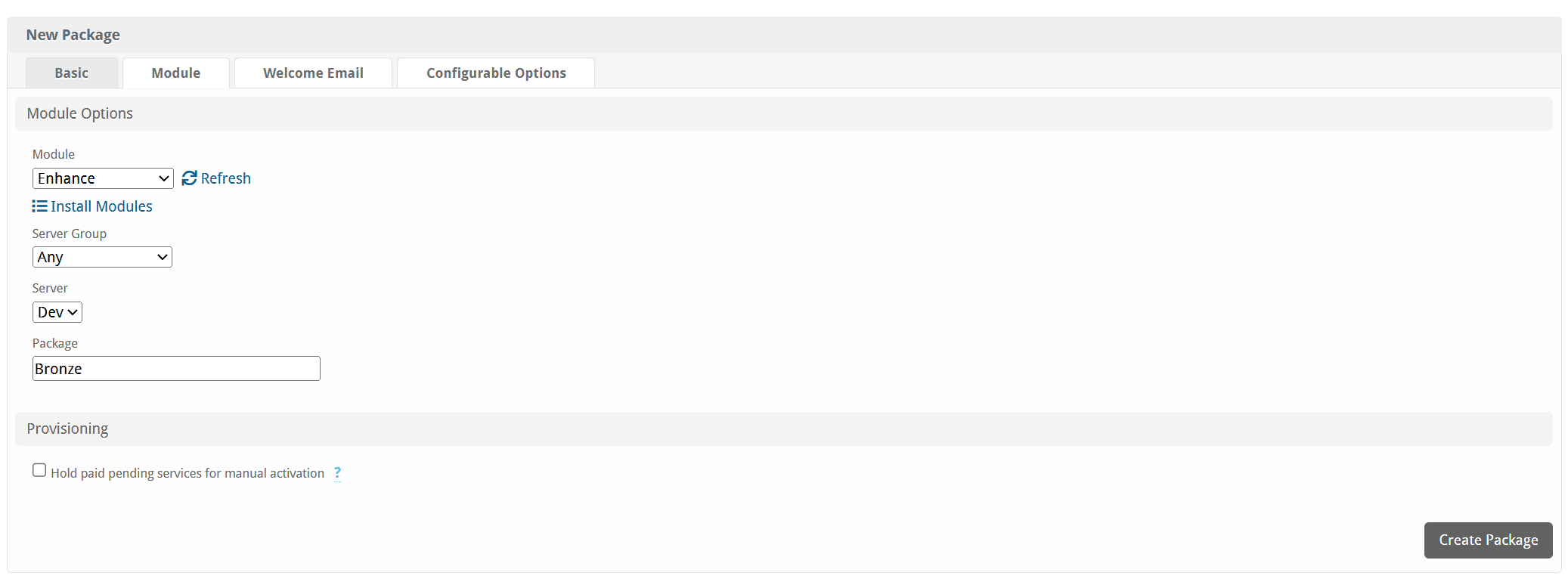 Packages define the pricing, welcome email, module and more. Packages can be assigned to Package Groups, and added to Order Forms. To create a Package, visit [Packages] > Browse, and click the "Create Package" button.