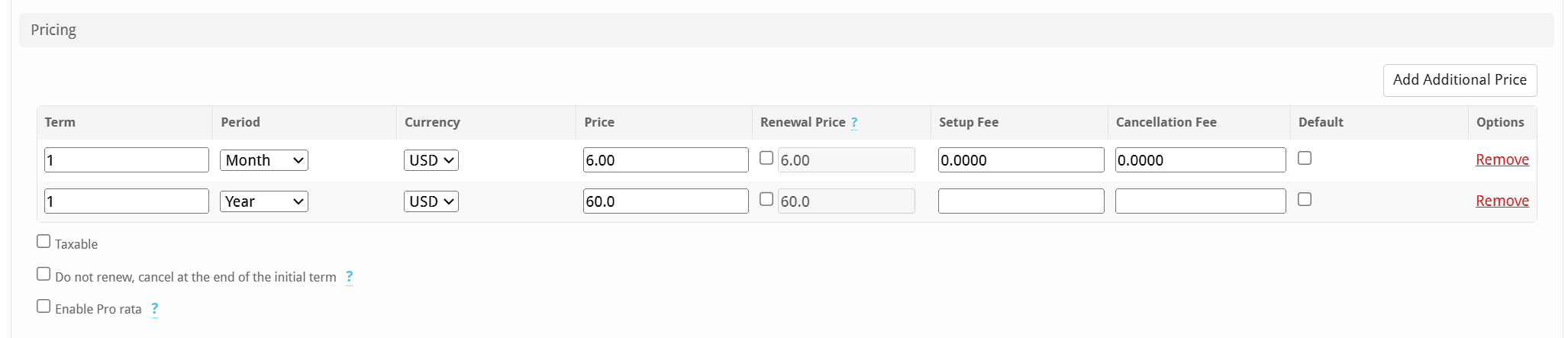 | Renewal Price | Enter the renewal price for this pricing option if it is different than the price. |
