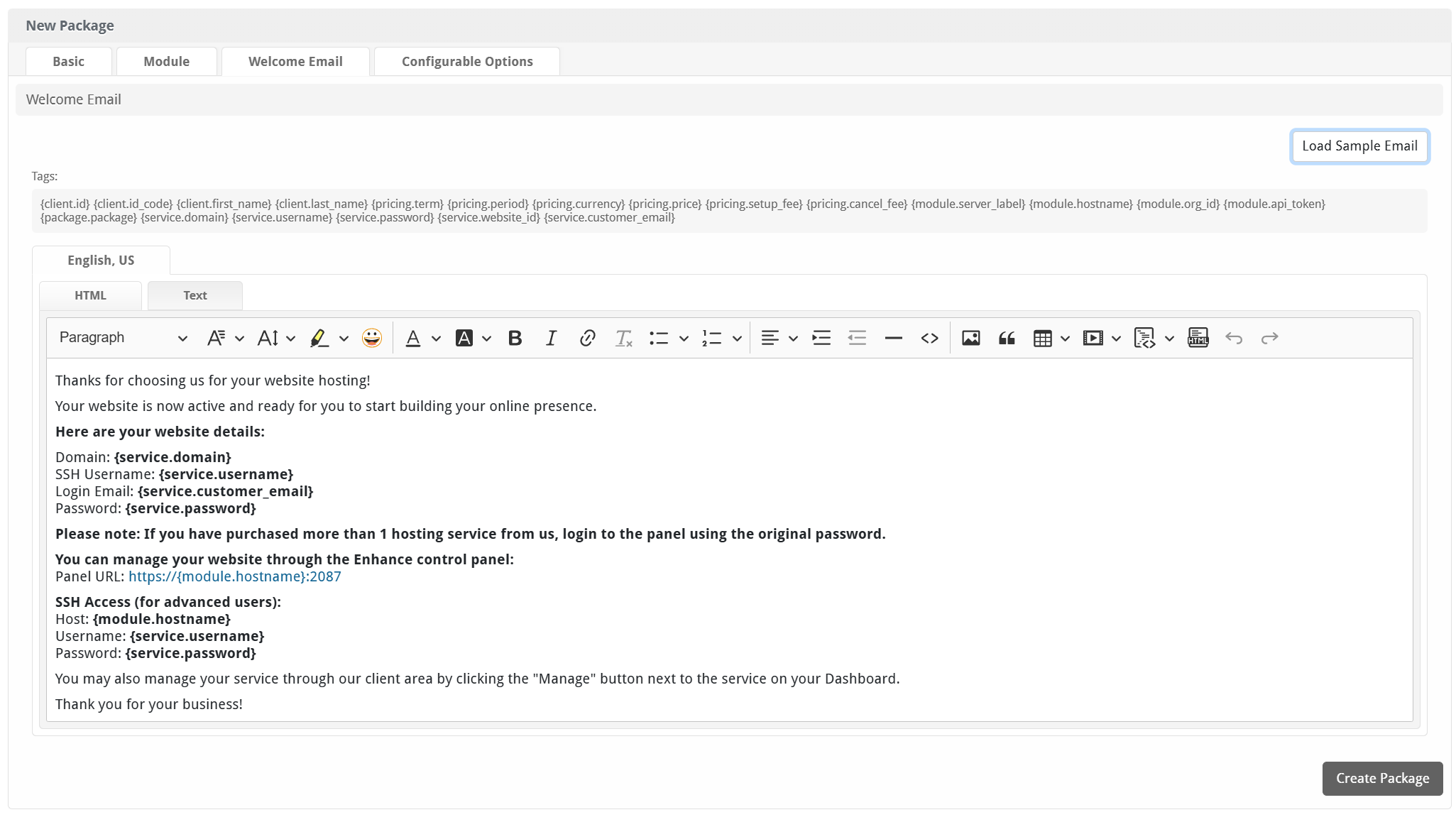 | Package | Select the Enhance Plan to use when configuring accounts. These values are pulled from Settings > Packages created in Enhance and specify resources for the plan. |