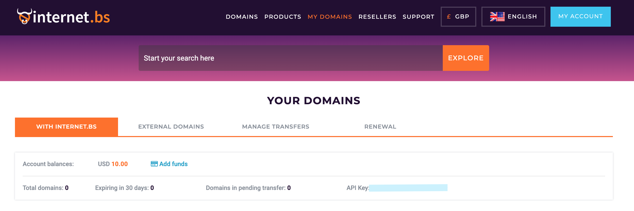 To get your Internet.bs API Key please go to My Account > Get my API Key.