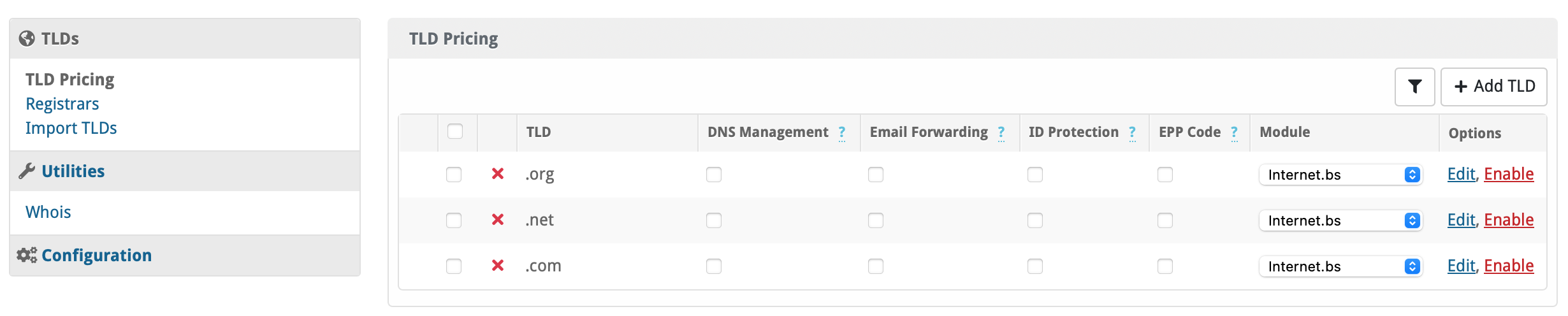 - Visit [Packages] > [Domain Options] > [TLDs] > Registrars.
