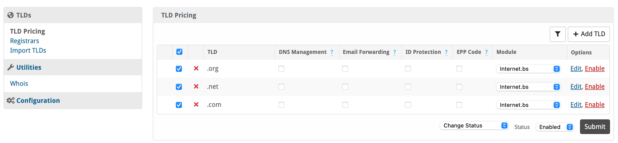Afterwards, enable the TLDs, tick the boxes and at the bottom change status to Enable and hit submit.