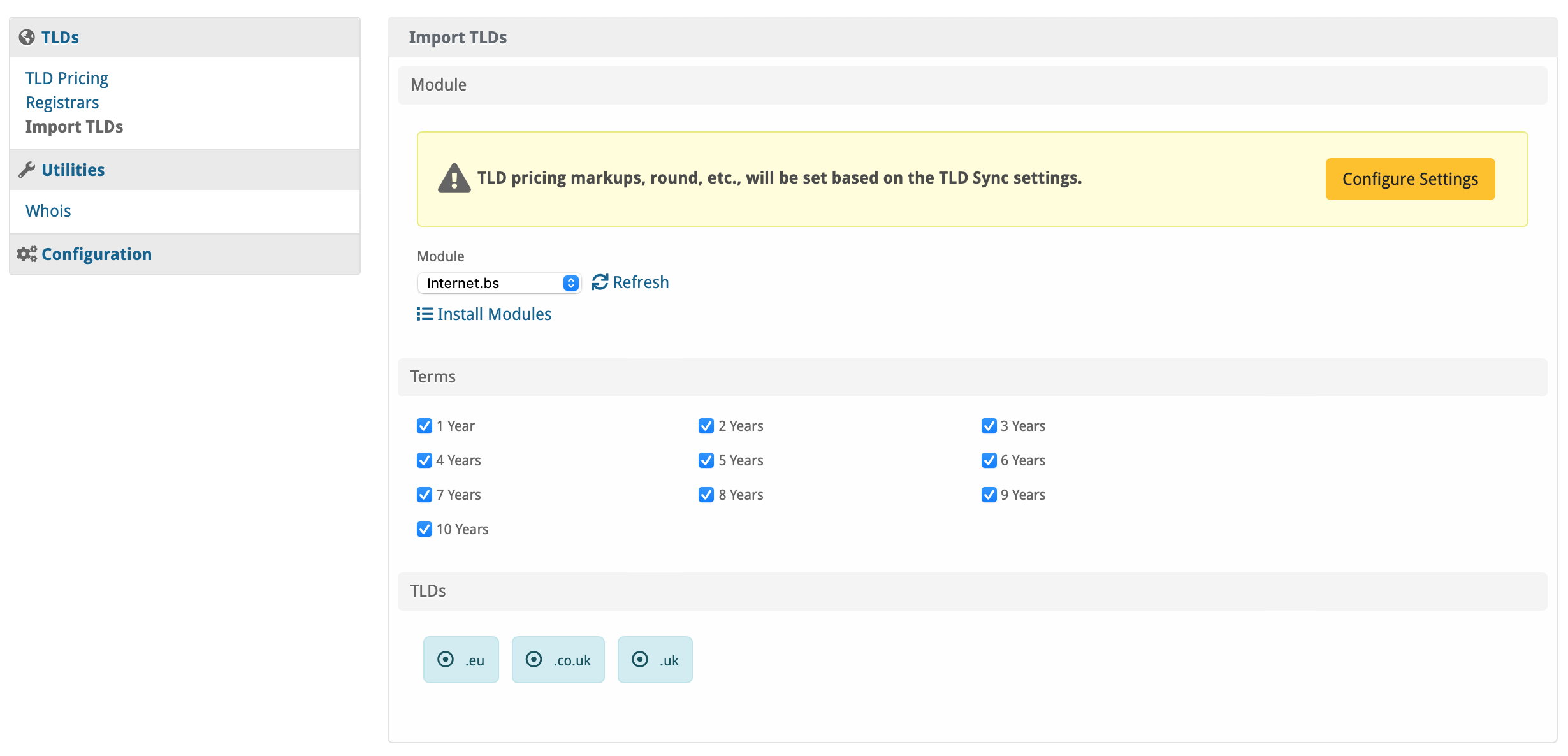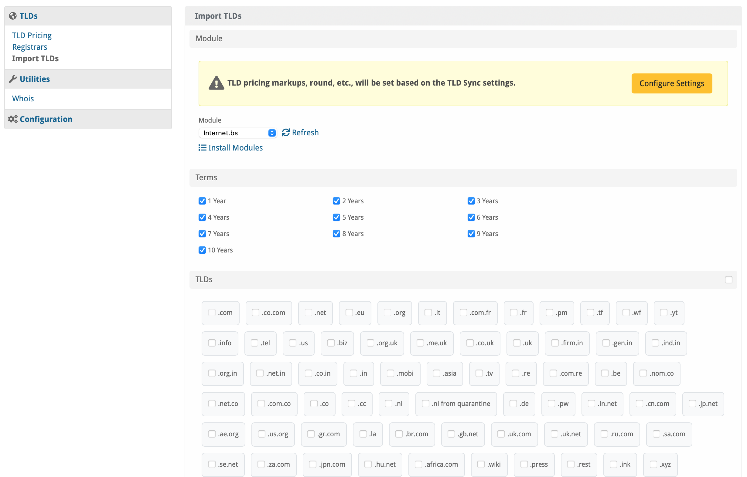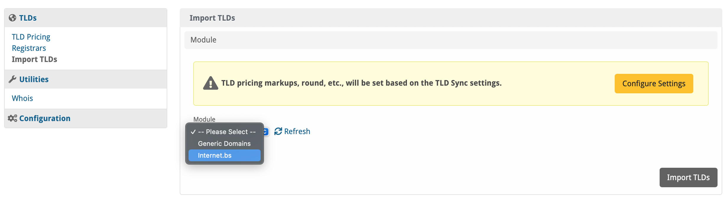 Firstly, change the module for the default TLDs (.org, .net, .com) to set them to Internet.bs, on the dropdown simply select Internet.bs: