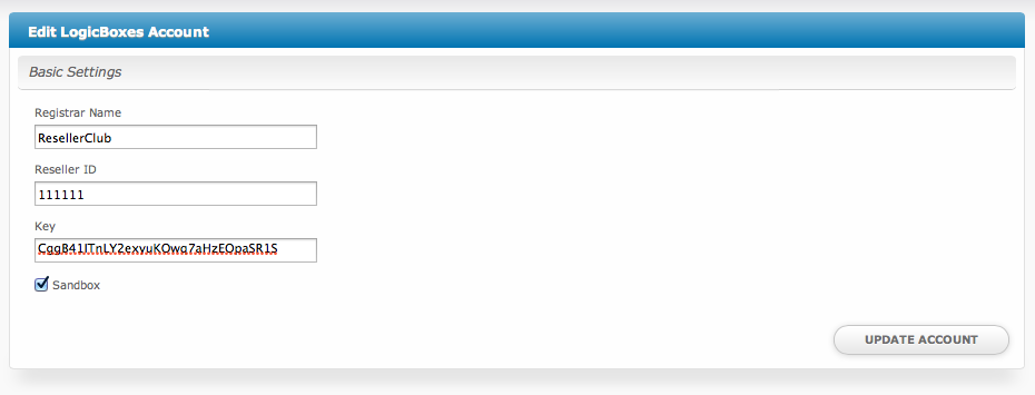 | Sandbox | Check to enable sandbox processing. This simulates API requests, and will not actually registrar domains. |