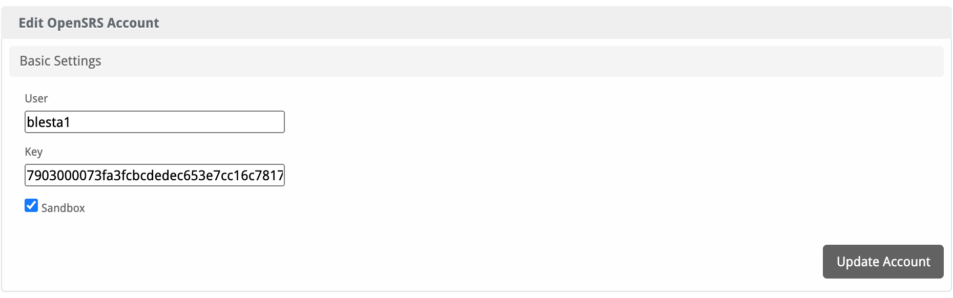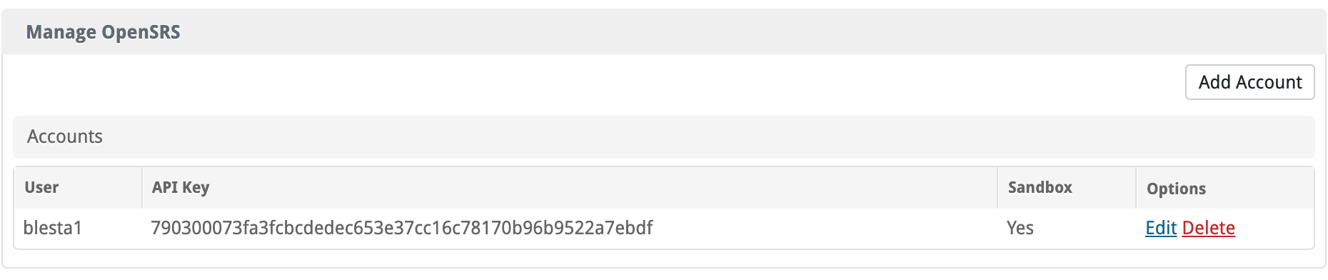 You can click [Add Account] to connect your OpenSRS account to Blesta.