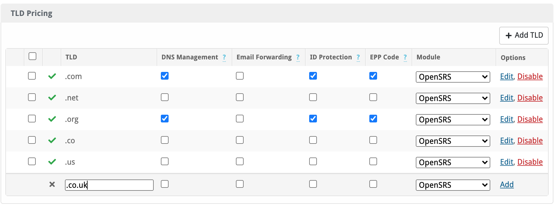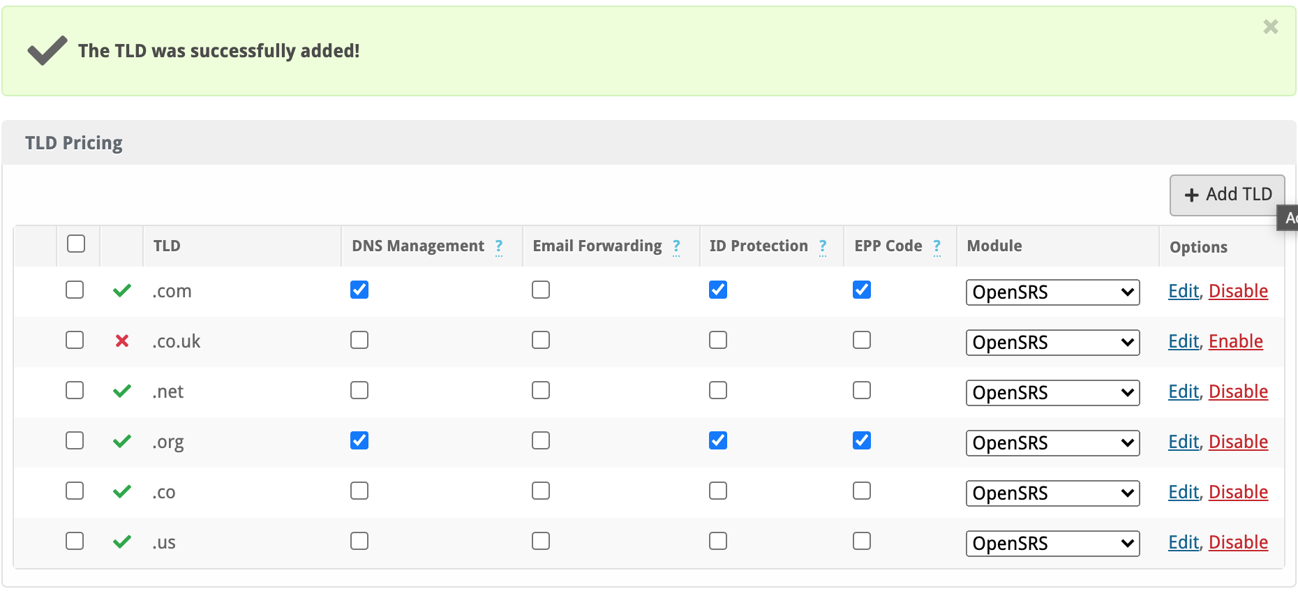 After adding the TLD by clicking Add you can enable the TLD. This will now show a green tick next to the TLD.