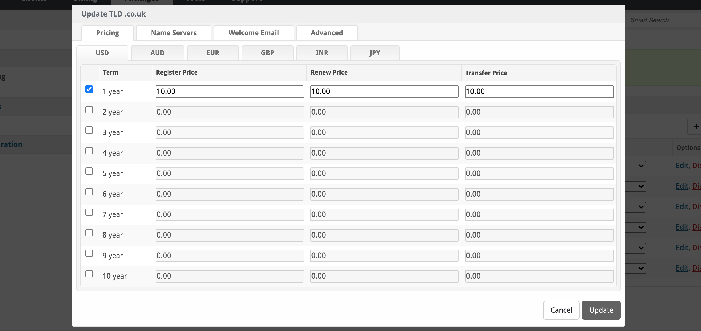 Tick the box for the terms you'd like to sell for this domain, fill in the register price, Blesta will auto-fill in the renew and transfer prices for you, simply edit them to fit your needs.