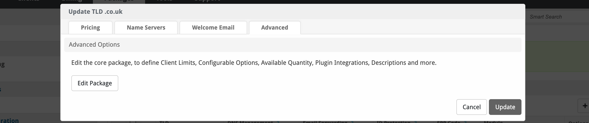 The Advanced section allows you to edit a registrar Package manually. Be careful when making changes directly to the Package, and only proceed if you know what you're doing.