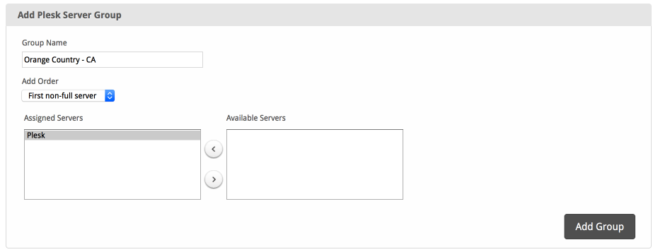 To add a server group, from the Plesk overview at [Settings] > [Company] > [Modules] > Plesk, click "Add Server Group", then enter the details.