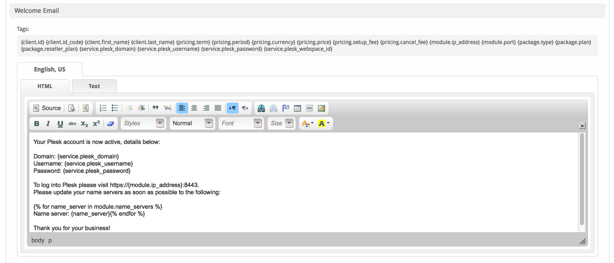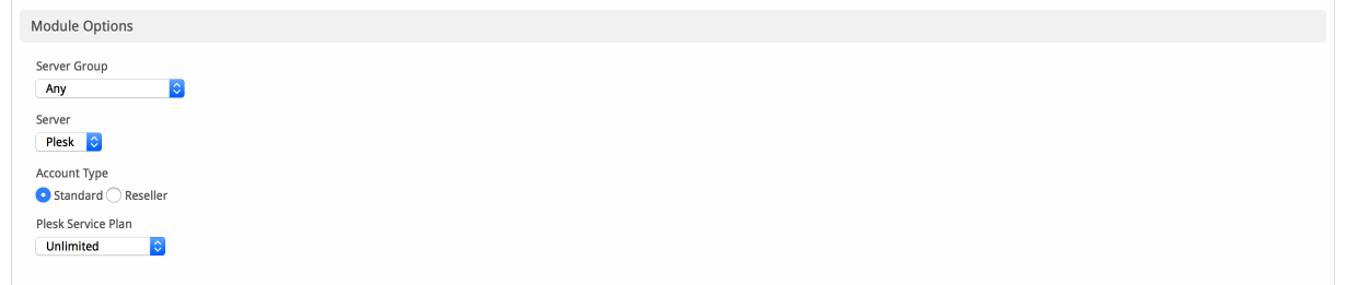 | Plesk Service Plan | Select the Plesk Package to use when configuring accounts. These values are pulled from "Plans" created in Plesk and specify resources for the plan. |