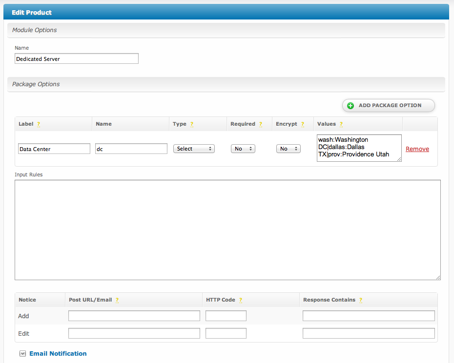 The Universal Module is the module to use when no other module will do. In some cases you may find that you need a module to request fields from a client for a particular service that will be provisioned manually. Dedicated servers are a perfect example of this. With the Universal Module you can create these fields dynamically, and even have them send a post or email notification when the package or service is created or changes.