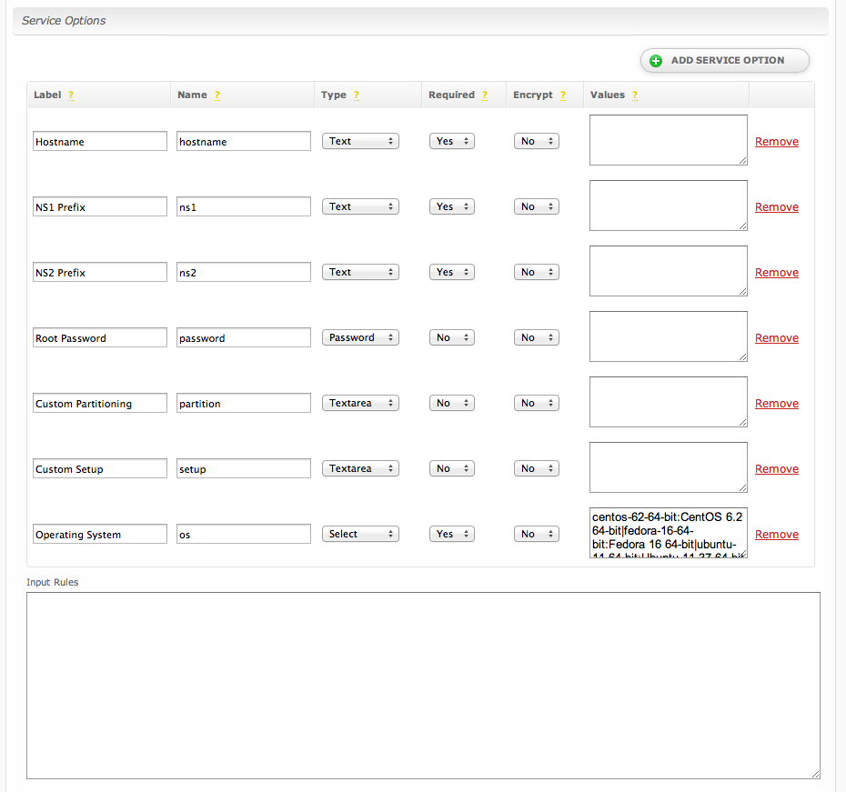 Service options are fields that are requested when a service is added or updated. A product can have any number of service options.