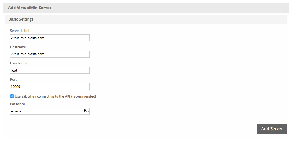 | Use SSL when connecting to the API (recommended) | If your Virtualmin server is using SSL/TLS over the defined port, check this box. |