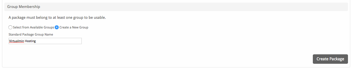 If this is the first Package you are creating with this module, select the "Create a New Group" option, and enter a Group name. If you are adding a subsequent Package and wish for it to be part of the same group, select "Select from Available Groups", and move the group from the right to the left of the multi-select box.